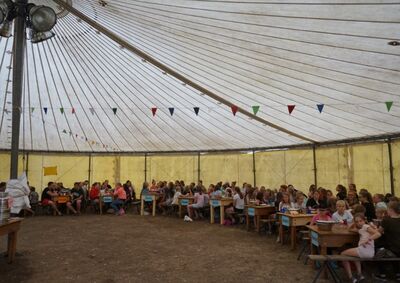 Unser persönliches Highlight von heute: Das Abendessen. Der ganze Tag war von Sonnenschein, blauem Himmel und kurzen Hosen geprägt – wunderbares Zeltlagerwetter eben. Was dann passierte, konnte höchstens der Wetterfrosch vorhersehen, leider hat er uns nicht gewarnt. Das komplette Lager war zum Abendessen im Tageszelt versammelt, als es auf einmal anfing leicht zu tröpfeln. Das wurde zunächst kaum von jemandem beachtet, die Hintergrundgeräusche hielten an und übertönten das leichte Tröpfeln des Regens. Auf einmal wurde es von jetzt auf gleich laut, nicht von den Kindern, der Regen hatte zugelegt. Es gallerte ohne Ende und die ersten Mitarbeiter waren zu sehen, wie sie ohne Regenjacke, in kurzer Hose, quasi dem Sommeroutfit, nach draußen rannten, um die Zelte zu schließen. Fast hat es sich angefühlt, als säßen alle im Inneren einer Trommel und jemand würde mit seinen Drumsticks ein Solo spielen. Der erste Schock und vielleicht auch ein kleines Grinsen vor Aufregung, wegen des ersten starken Regens, war auf den meisten der Kindergesichtern zu erkennen. Jetzt kommt die Wendung: Das erste Wasser läuft unter das Tageszelt, als das Mädchenlager ein Lied anstimmt. „Groß ist unser Gott“ wird gesungen, Mädchenstimmen erfüllen das Tageszelt, gepaart mit dem Regen, der für die richtige Stimmung sorgt. Beim nächsten Jungscharlied stimmen auch die Jungen mit ein, Tassen werden im Takt gekloppt und feuern die Mitarbeiter an, die Schlicker-Schitze und Gräben graben, damit das Wasser abläuft.