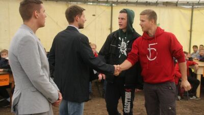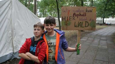 Als nächsten Schritt wurden die Kinder in bunt gemischte Gruppen eingeteilt und bekamen jeweils einen Aktivisten zur Seite gestellt. In der letzten halben Stunde bis zum Mittagessen lernten sie von ihm zum Beispiel das Reimen von Schlachtrufen und das Malen von Demo-Plakaten. Beim Mittagessen wurden diese Rufe und Plakate schon ordentlich zur Schau getragen, um die ebenfalls anwesenden Bauarbeiter einzuschüchtern. Wirklich geholfen hatte das allerdings kaum bis gar nicht. Die Arbeiter verließen das Essen pünktlich, um die ersten Flächen zu „sprengen“ und die ersten Zelte abzumontieren, und das vor den Augen der Teilnehmer.