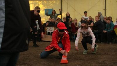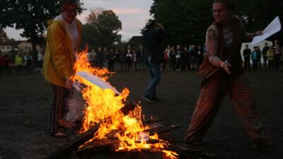 So waren die Kinder am Ende das Nachmittags nicht nur in der Lage auf Bauarbeiter zu werfen, sondern auch sich vor ihnen zu verstecken oder zu meditieren und das Grüne in der Welt zu finden. Tatsächlich waren diese erarbeiteten Eigenschaften sehr sinnvoll und die Kinder konnten von ihnen am Abend profitieren. Vor ein paar Minuten noch spielten sie in verschiedenen Spielen gegen die Bauarbeiter um den Zeltplatz zu retten und den Bau des Flughafens zu stoppen. Am Ende konnten alle Teile der wichtigen Baupläne auf dem Zeltplatz gefunden und erfolgreich verbrannt werden. Die Bauarbeiter wurden mit schallenden „Ihr könnt nach Hause gehen!“-Gesängen aus der Runde verbannt. Erstaunlicherweise gestanden sie sich ihr Versagen ein und verschwanden ohne Widerworte.