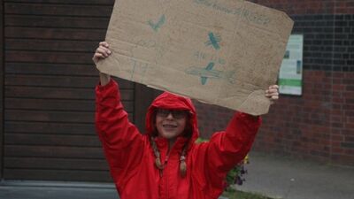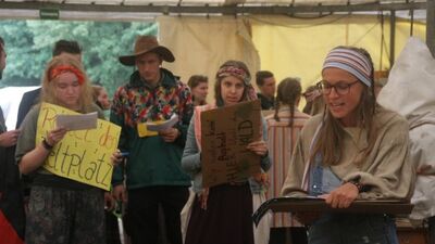 Morgen würden die Arbeiten beginnen, die Zelte müssten deswegen natürlich heute noch weg. Die Lagerleitung zeigte sich schockiert. Und als selbst Diskutieren mit den Managern nichts brachte, rief Niklas Niedermeier seine Freunde von früher an, in der Hoffnung, dass es sich bei ihnen um die letzte Rettung für das Zeltlager handelt. Diese entpuppten sich als Umwelt-Aktivisten und Demonstranten. Bewaffnet mit Demo-Plakaten, Ukulelen und Peace-Zeichen wollen sie den Teilnehmern helfen das Zeltlager zu retten. Man hört sie schon von weitem mit ihren Trillerpfeifen und Demo-Rufen wie: „Attacke, Attacke, Fliegen ist kacke!“. Als die Gruppe von bunt gekleideten Hippies das Tageszelt betrat, war es definitiv ein Gänsehautmoment. Alle Teilnehmer waren fasziniert und verfolgten gebannt den Demonstrationszug. Eine Einheit aus weiten Hosen, geflochtenen Haaren und Plakaten, die jubelnd und rufend die Aufmerksamkeit der Kinder auf sich zogen. Von der ersten Sekunde an war klar, sie können helfen. Auch die Kinder waren Feuer und Flamme und stimmten direkt in laute „Zeltlager Ja! Flughafen Nein!“-Rufe mit ein.